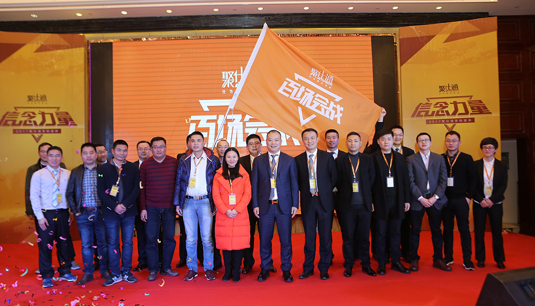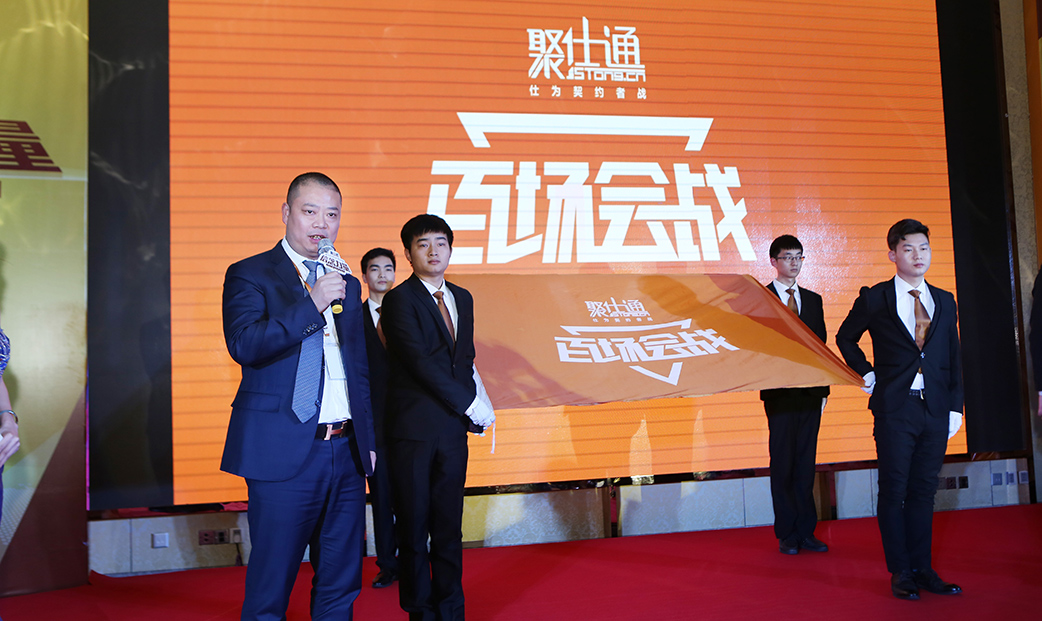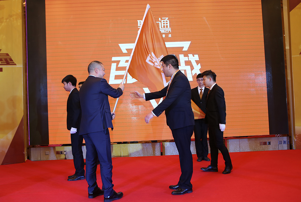 2017年聚仕通百场会战启动仪式暨战旗揭幕仪式将现场的氛围推向了高潮。随着全场灯光骤然熄灭,四位雄姿英发的护旗手伴随着激昂磅礴的战乐,拥护着战旗精神昂扬的缓缓走向舞台……从何总手中郑重接过战旗的龙总响亮的承诺:保证完成任务。