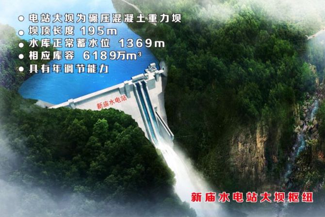新庙水电站是浙江省四川商会高级顾问王德军在荥经县投资10.6亿元的在建项目,装机容量81MW,年均发电量达3.3亿千瓦,建成后将会产生较大社会效益和经济效益。