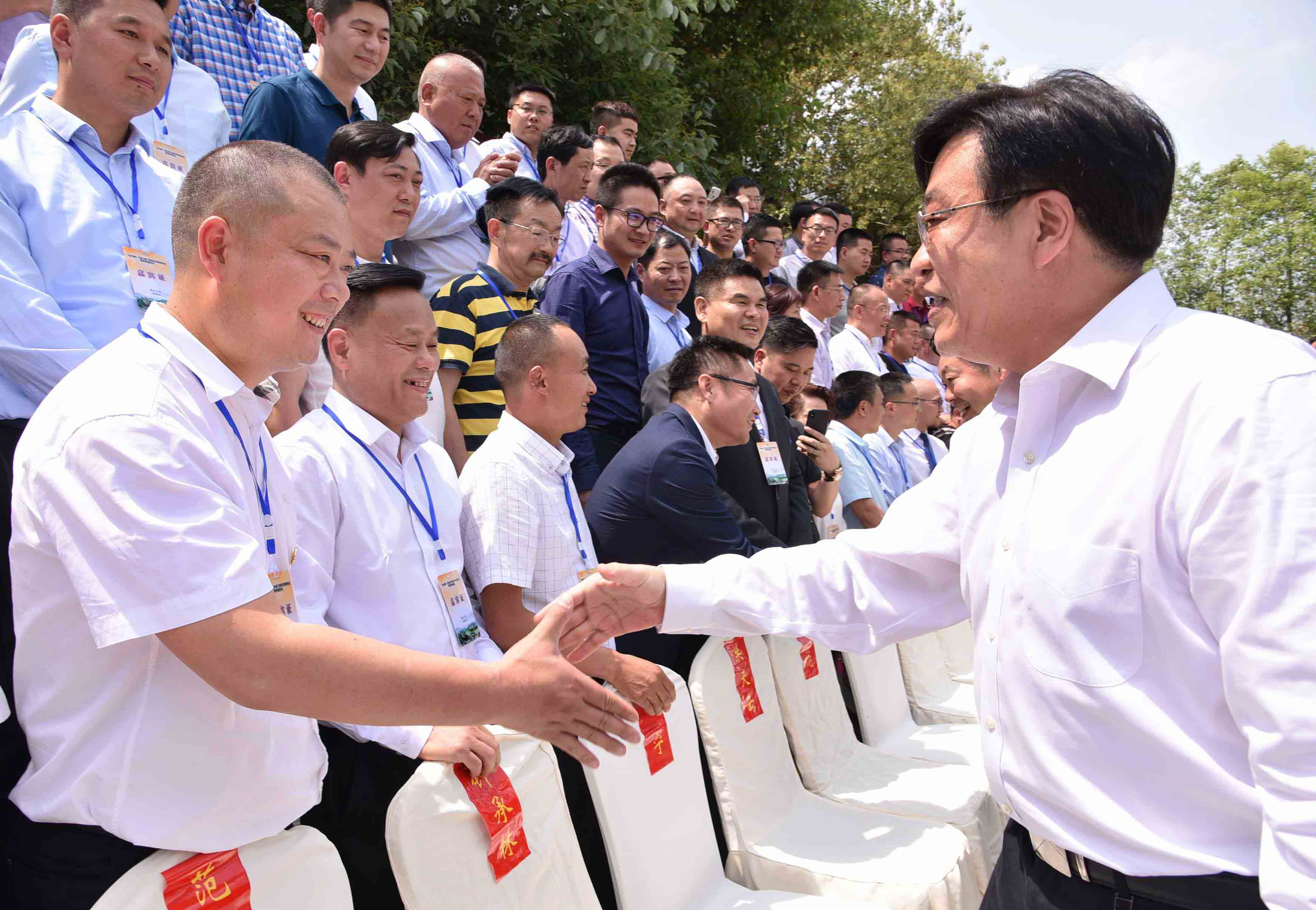 (浙江省委常委、副省长冯飞和朗佑控股董事长何勇握手)