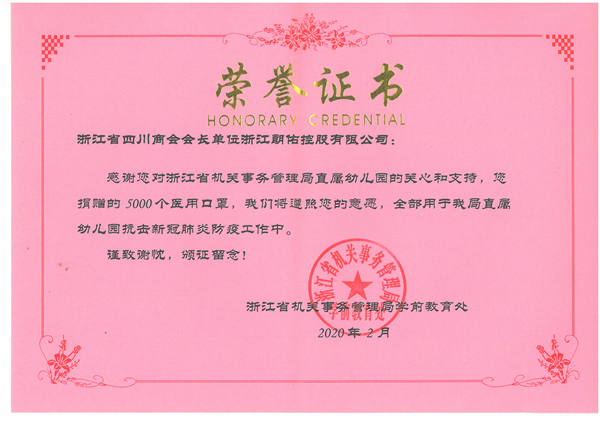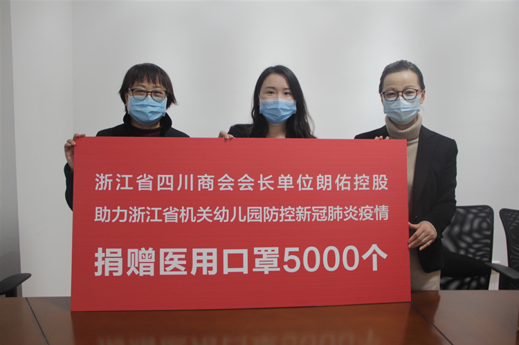 2020年2月24日,浙江朗佑控股有限公司助力浙江省机关幼儿园防控新冠肺炎疫情捐赠医用口罩5000个。