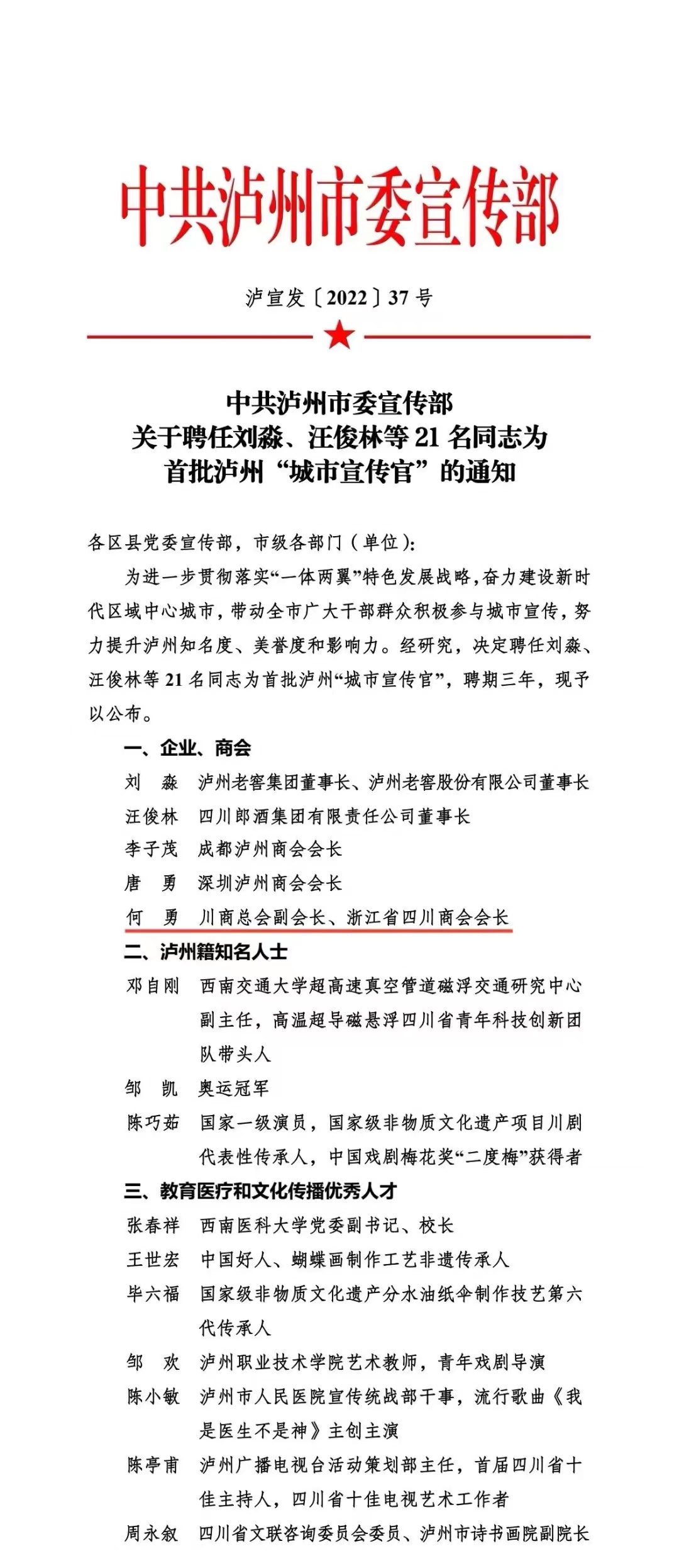 近日,中共泸州市委宣传部公布首批泸州“城市宣传官”名单,浙江省四川商会会长、朗佑控股董事长、朗佑堂创始人何勇被聘为首批泸州“城市宣传官”。
