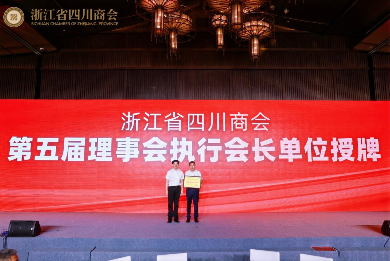 四川省人民政府驻上海办事处经济合作处四级调研员代鹏,浙江省四川商会执行会长赵崇甫为商会第五届理事会理事单位授牌