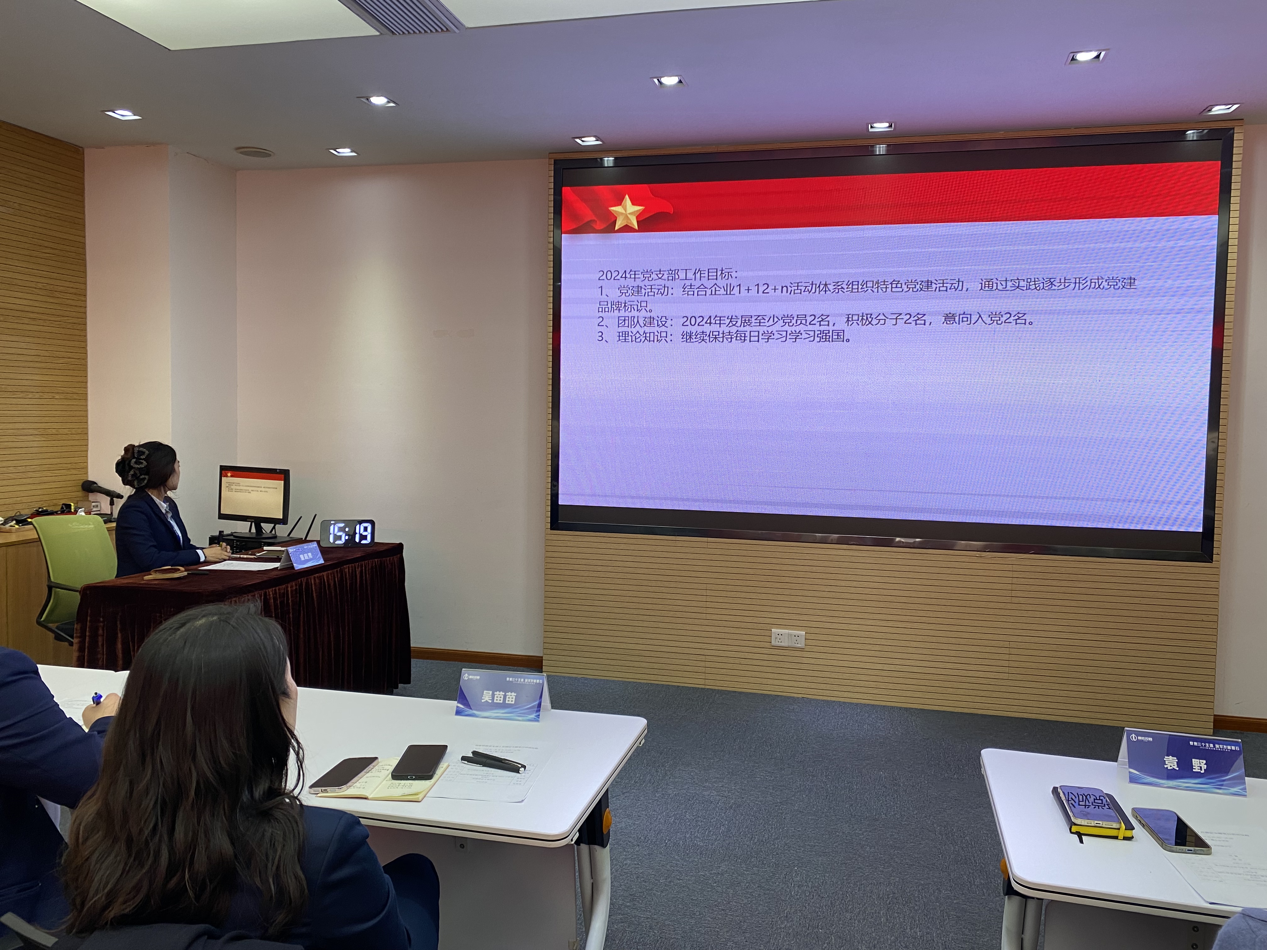随后,支部党务童超男进行2023年党支部工作成果汇报及2024工作目标确认,并发起党支部年度活动方案讨论,成员们纷纷进行意见分享,提出年度活动与党建活动融合、与公益活动融合、与公司亮点融合等创新构思,为丰富年度活动建言献策。